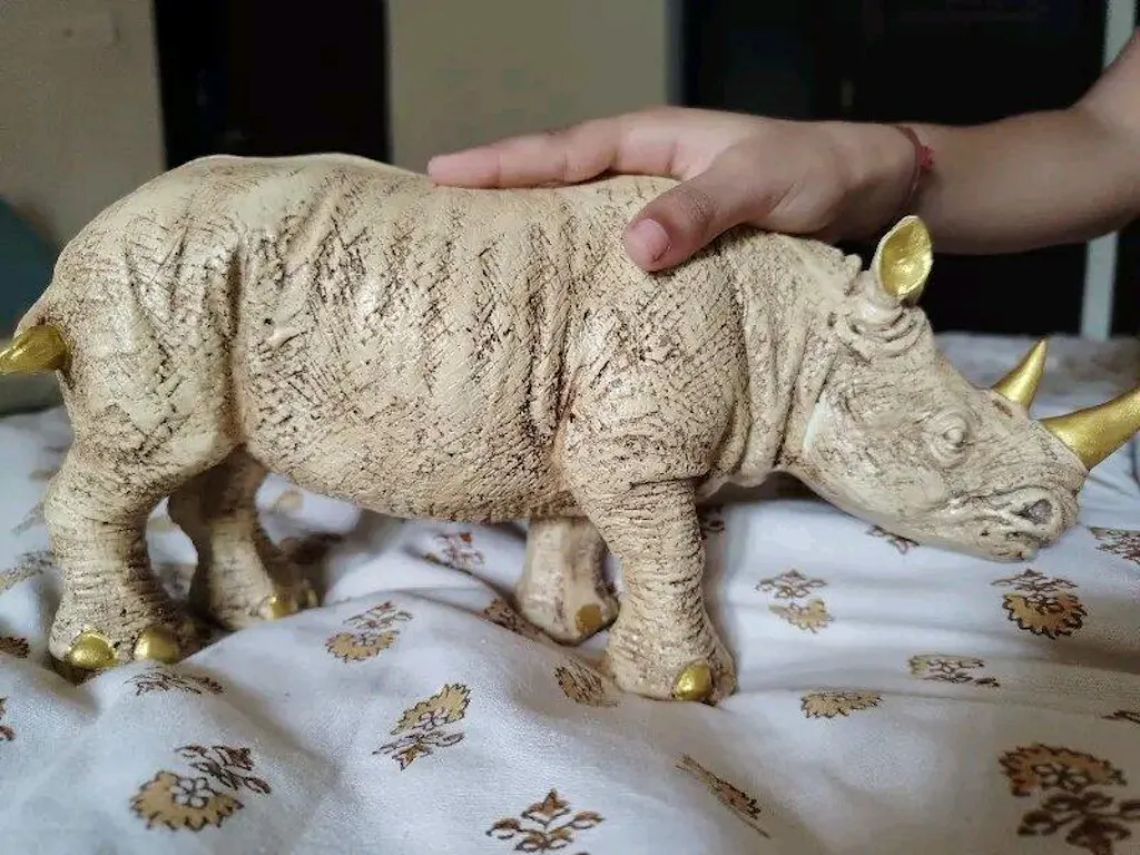 Bring home the power and resilience of the wild with this exquisitely crafted Rhino Statue. Designed with a rustic stone-textured finish and adorned with golden accents on the horns, hooves, and tail, this piece beautifully blends strength with elegance. Perfect as a centerpiece for your living room, study, or office, it symbolizes protection, stability, and endurance—making it not just a décor item, but a statement of timeless charm.