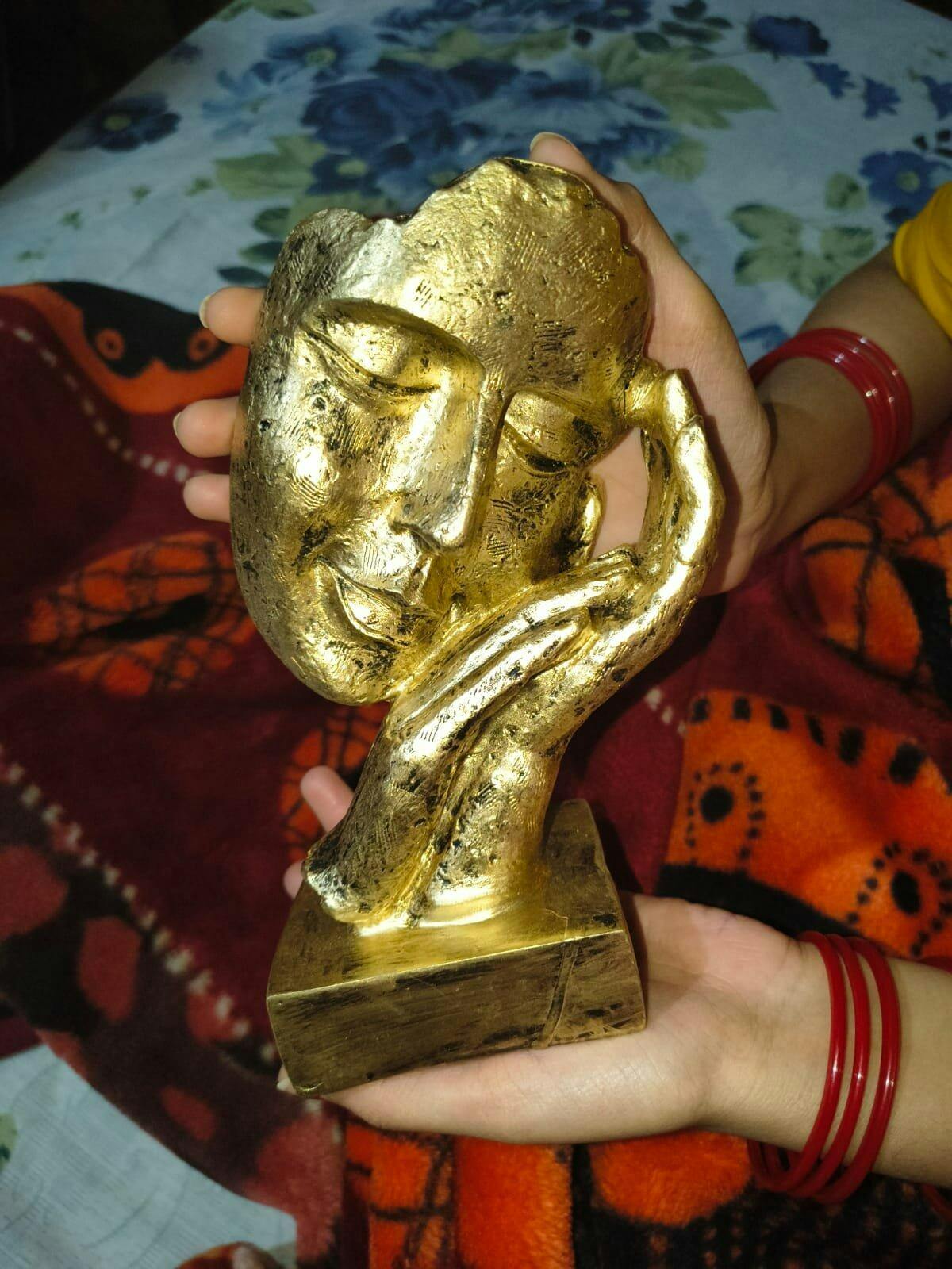 Add a touch of contemporary elegance to your space with this Abstract Resting Face Sculpture. Crafted with fine attention to detail, the piece features a serene face resting gently on a hand, symbolizing peace, introspection, and artistic expression. The textured finish and subtle metallic tones create depth and visual interest, making it an ideal centerpiece for modern living rooms, offices, or galleries. Perfect for art enthusiasts and interior designers alike, this sculpture brings sophistication, tranquility, and a thought-provoking aesthetic to any decor.